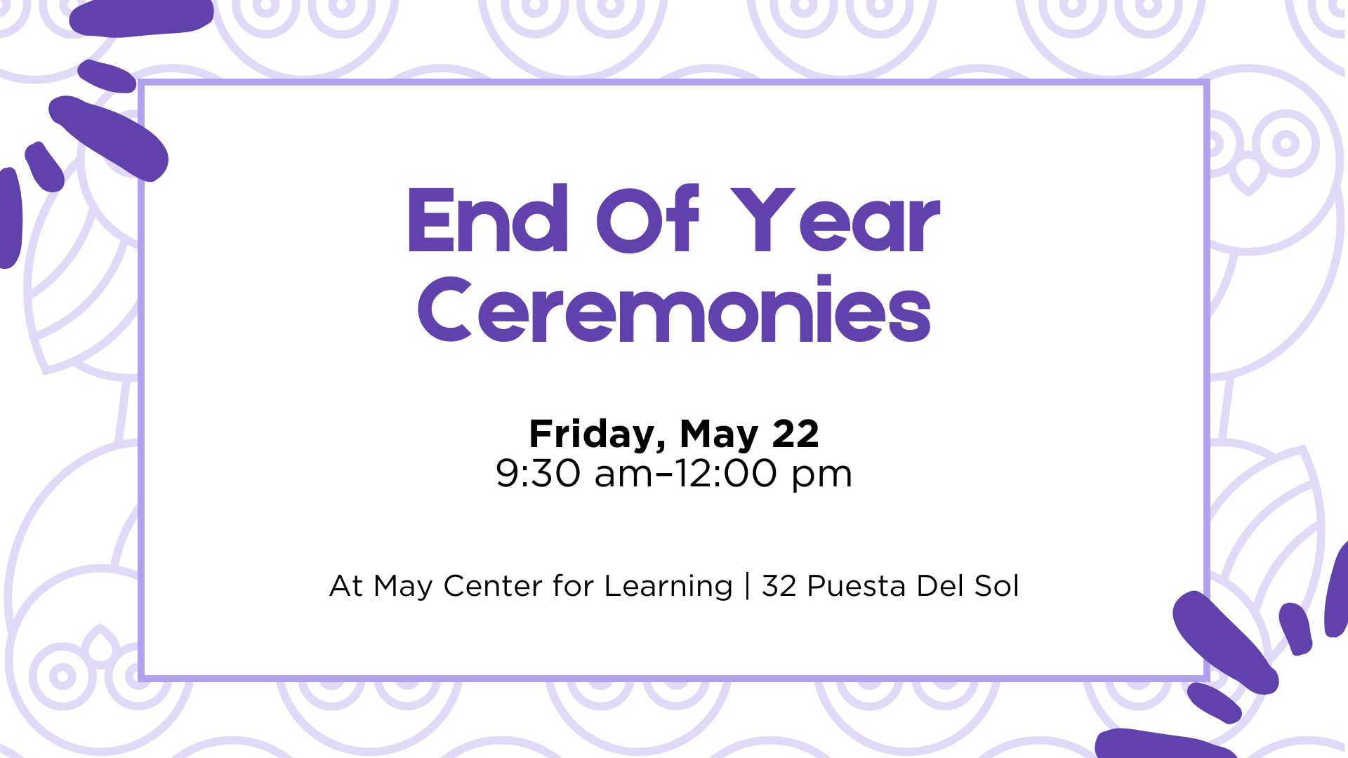 Congrats, grads! Celebrate our May School students at their End Of Year Ceremonies on Friday, May 22. All May School families, extended family, and friends are welcome to attend.